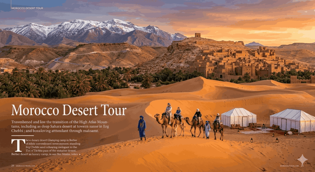 No classic journey is complete without an excursion to the Erg Chebbi dunes near Merzouga or the more remote Erg Chigaga dunes near M’hamid. The transition from the rocky “hamada” desert to the towering orange sand dunes is a cinematic experience. In 2026, the trend in desert travel has shifted toward luxury glamping. High end camps now offer en suite bathrooms, gourmet dining, and solar powered facilities, allowing travelers to enjoy the wilderness without sacrificing comfort. As highlighted in professional travel reviews by Forbes, the expansion of luxury services into remote areas has redefined the desert experience, making it a highlight for even the most discerning global travelers.