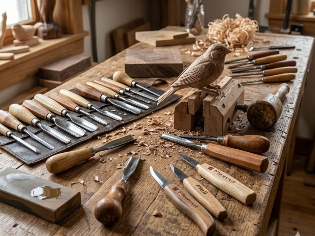 While cutting tools receive most of the attention, support tools are just as important in a professional carving setup. A wooden or urethane mallet allows the sculptor to drive chisels with controlled force, especially during rough shaping or when working dense hardwoods. Stable clamping systems, carving vises, and bench dogs keep the workpiece secure and reduce the risk of slipping during delicate cuts.