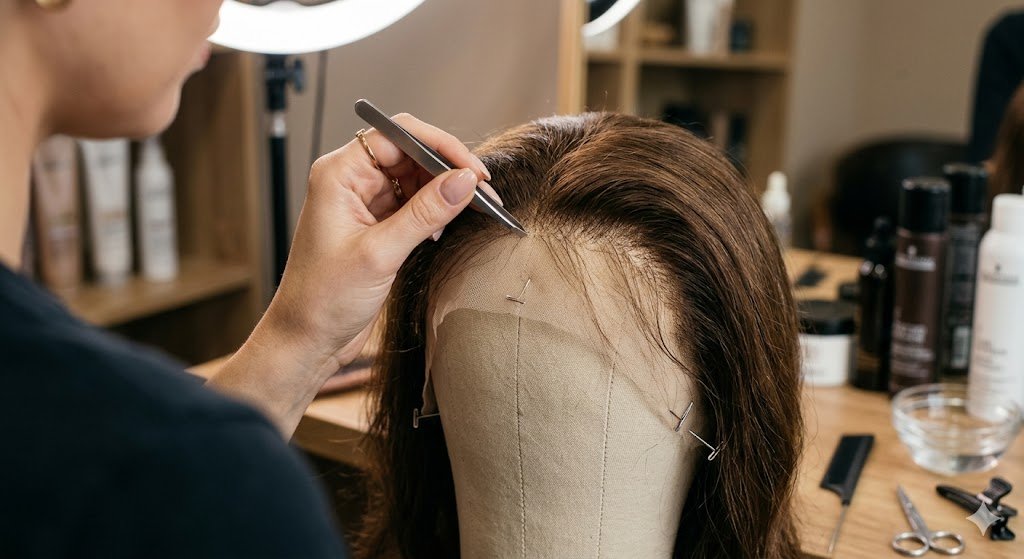 Using a specialized lace glue allows for a long-wear install (1–3 weeks). The secret here is thin layers. Apply the glue, wait for it to turn completely clear, and then lay the lace. Use a “melt band” or a silk scarf to tie the hairline down for at least 10–15 minutes after the install. This pressure is what fuses the lace to the skin.